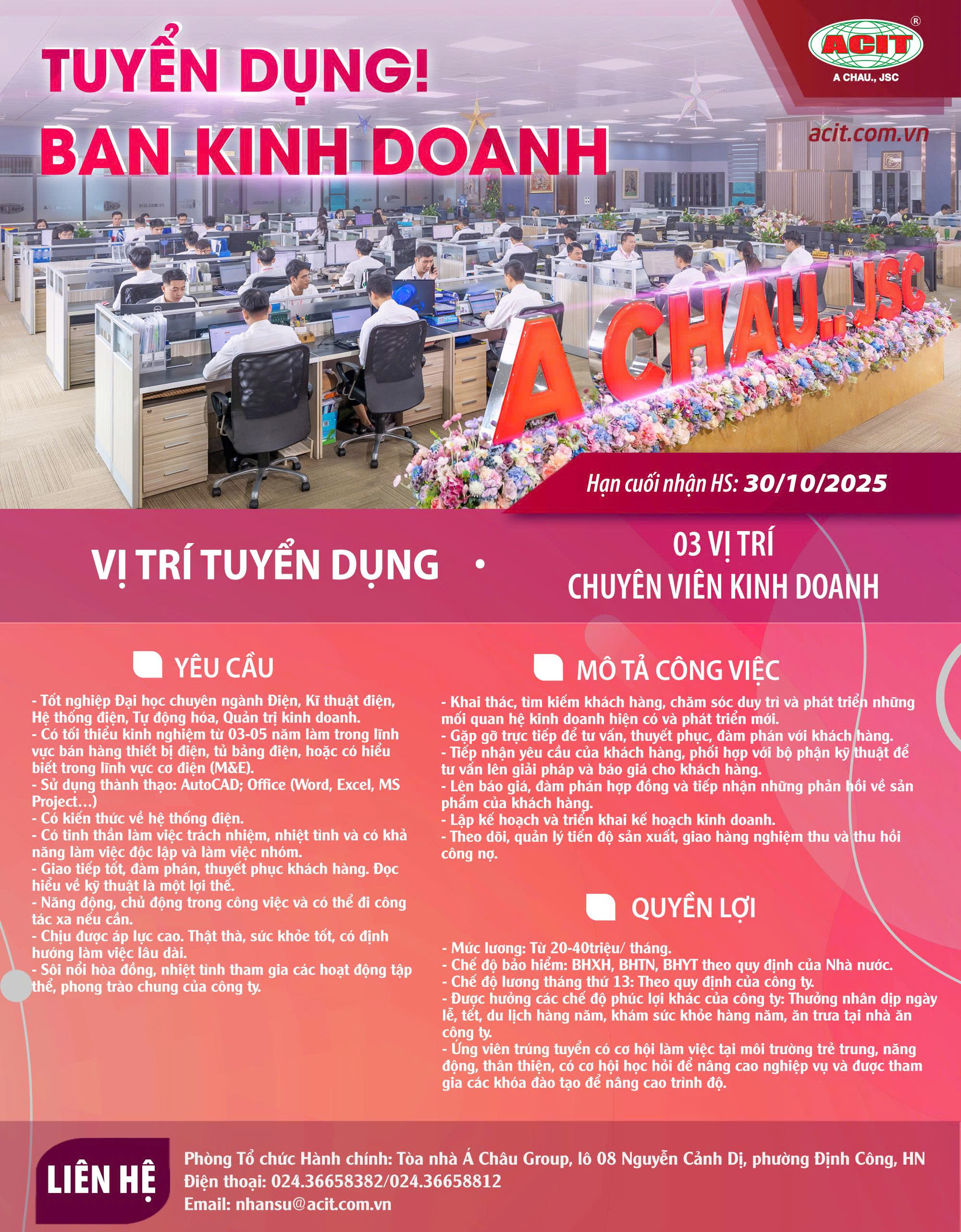 - Phòng Tổ chức Hành chính, tầng 4 tòa nhà Á Châu Group, lô 08 Nguyễn Cảnh Dị, phường Đại Kim, quận Hoàng Mai, Hà Nội.